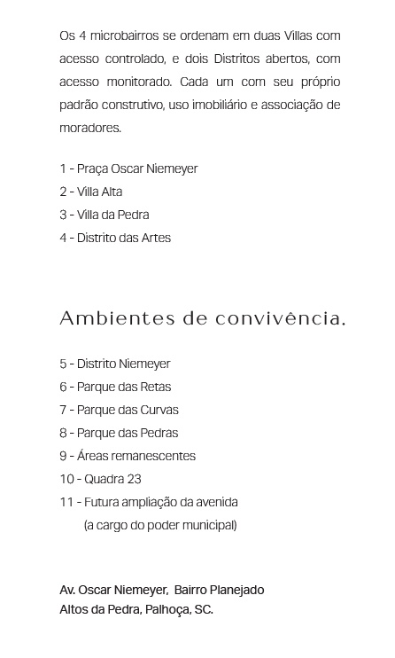 Mais do que um lugar para morar, no Altos da Pedra você encontra uma comunidade vibrante e acolhedora, com tudo o que você quer e precisa a uma curta distância, desde comércio e serviços até parques, trilhas e mirantes que colocam o horizonte aos seus pés. E tudo isso com fácil acesso à capital, Florianópolis, e às rodovias que levam ao interior do estado e às praias do nosso litoral.